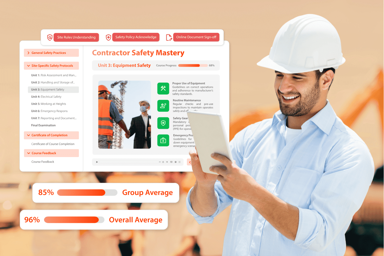 - Compliance and Safety Training: Assign relevant training modules covering safety protocols, industry standards, and company policies through a variety of digital formats – video, gamified lessons and interactive quizzes – empowering contractors to learn anytime, anywhere.